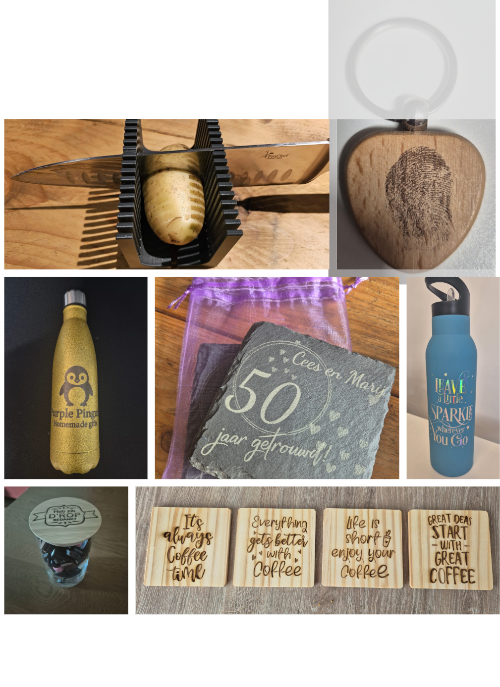 Wat purplepinguin.nl zo speciaal maakt, is dat we homemade cadeautjes maken, gegraveerd, gelaserd of 3d-geprint. Ook gepersonaliseerd! Het leukst vind ik om gepersonaliseerde cadeautjes te maken, dus kom maar op met jullie vragen, wensen en ideeën!