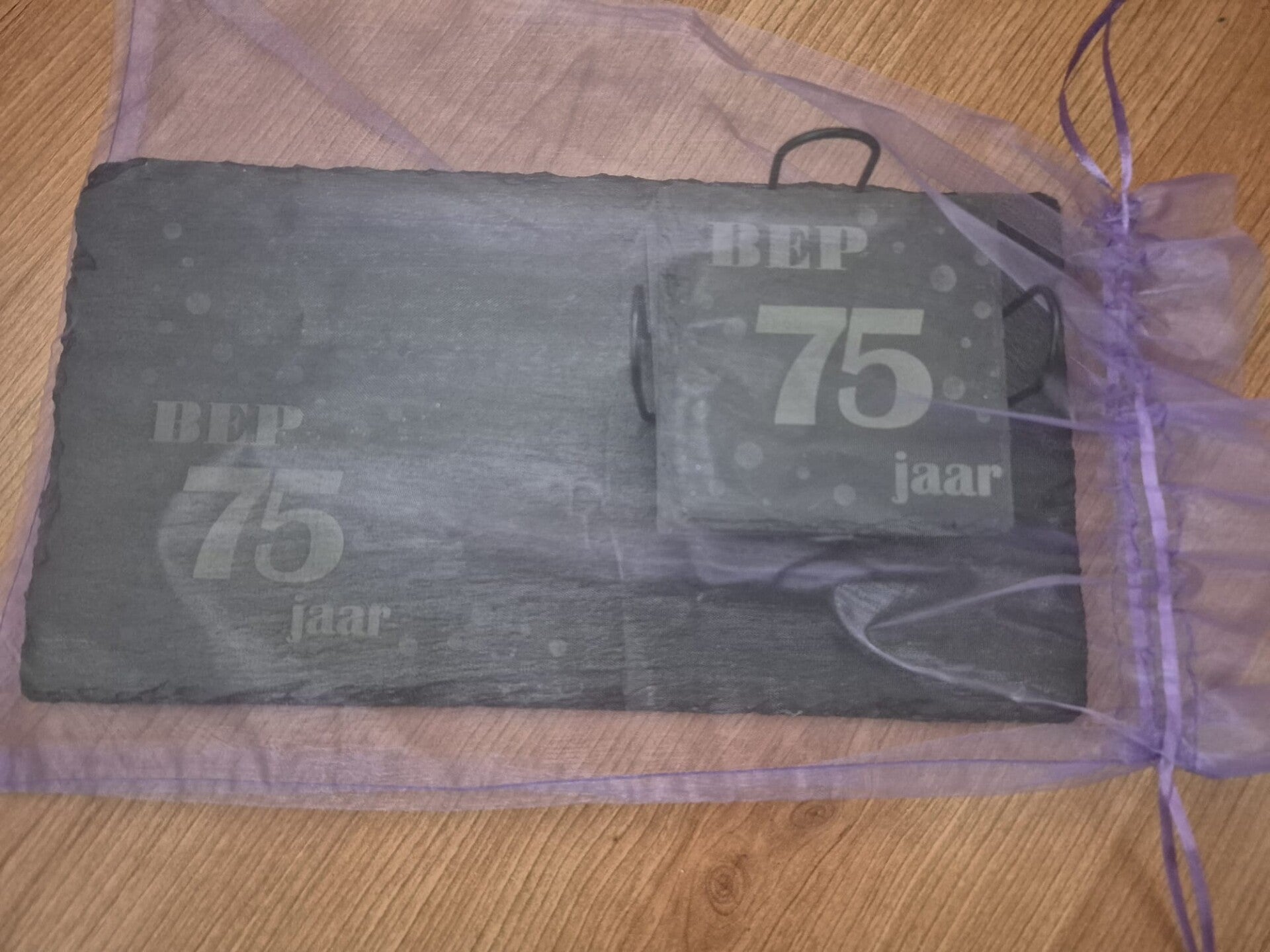 Set van borrelplateau met 4 onderzetters in metalen houder.